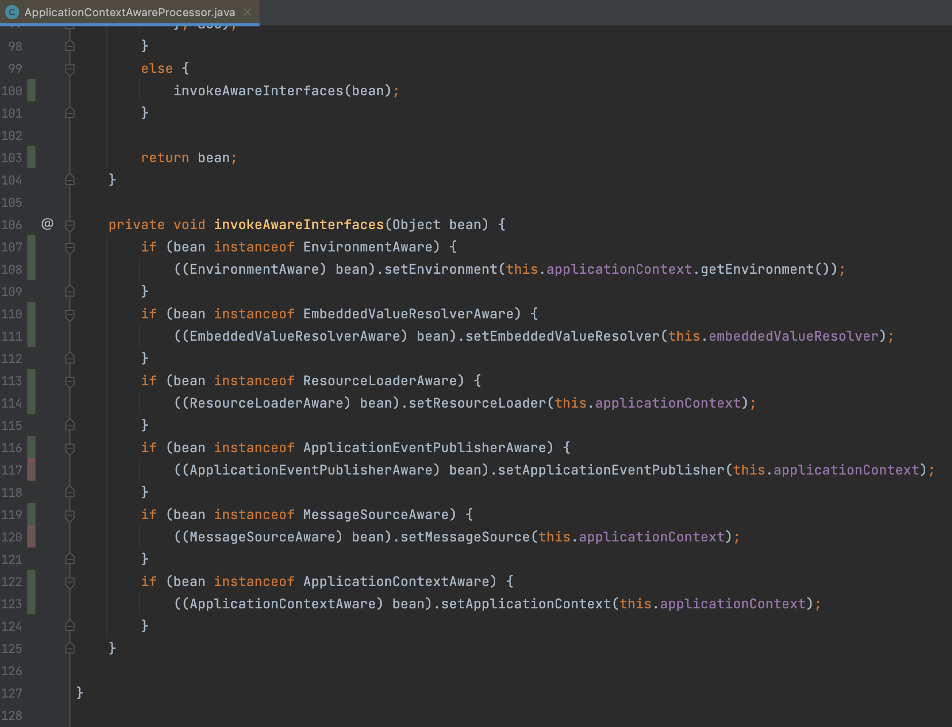 并不是所有的Aware接口都使用同样的方式调用。Bean××Aware都是在代码中直接调用的,而ApplicationContext相关的Aware都是通过BeanPostProcessor#postProcessBeforeInitialization()实现的
