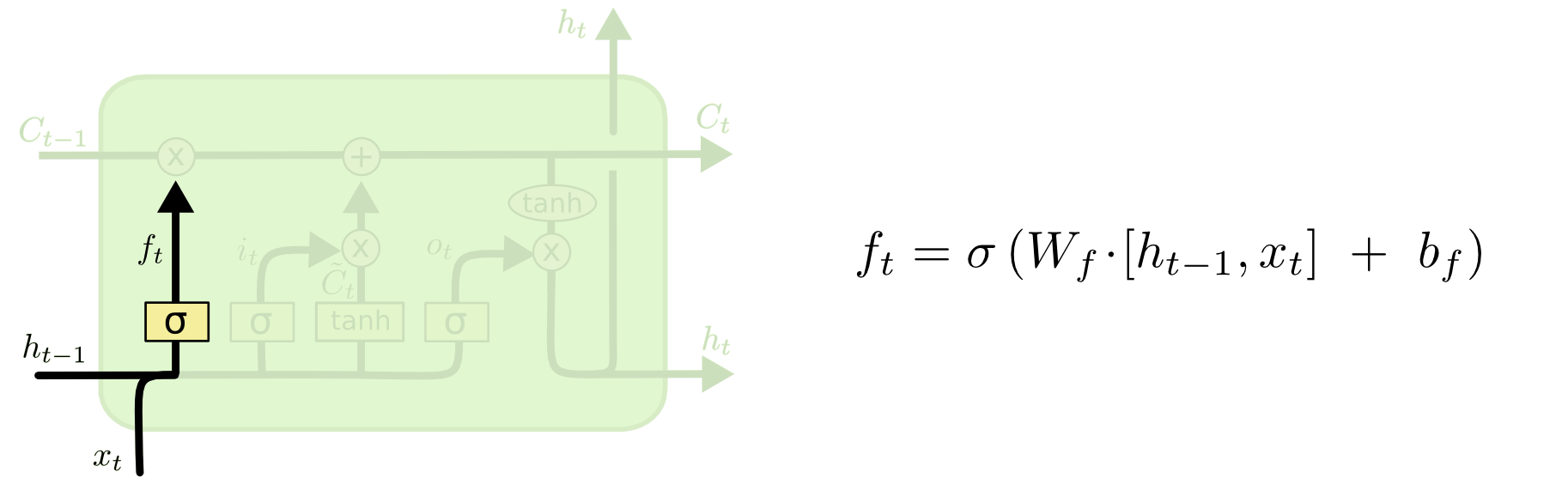 The first step in our LSTM is to decide what information we’re going to throw away from the cell state. This decision is made by a sigmoid layer called the “forget gate layer.” It looks at $h_{t−1}$ and $x_t$, and outputs a number between 00 and 11 for each number in the cell state $C_{t−1}$. A 1 represents “completely keep this” while a 0 represents “completely get rid of this.”