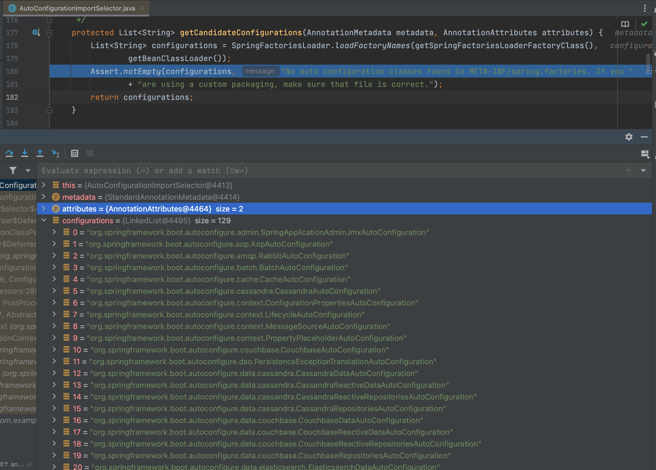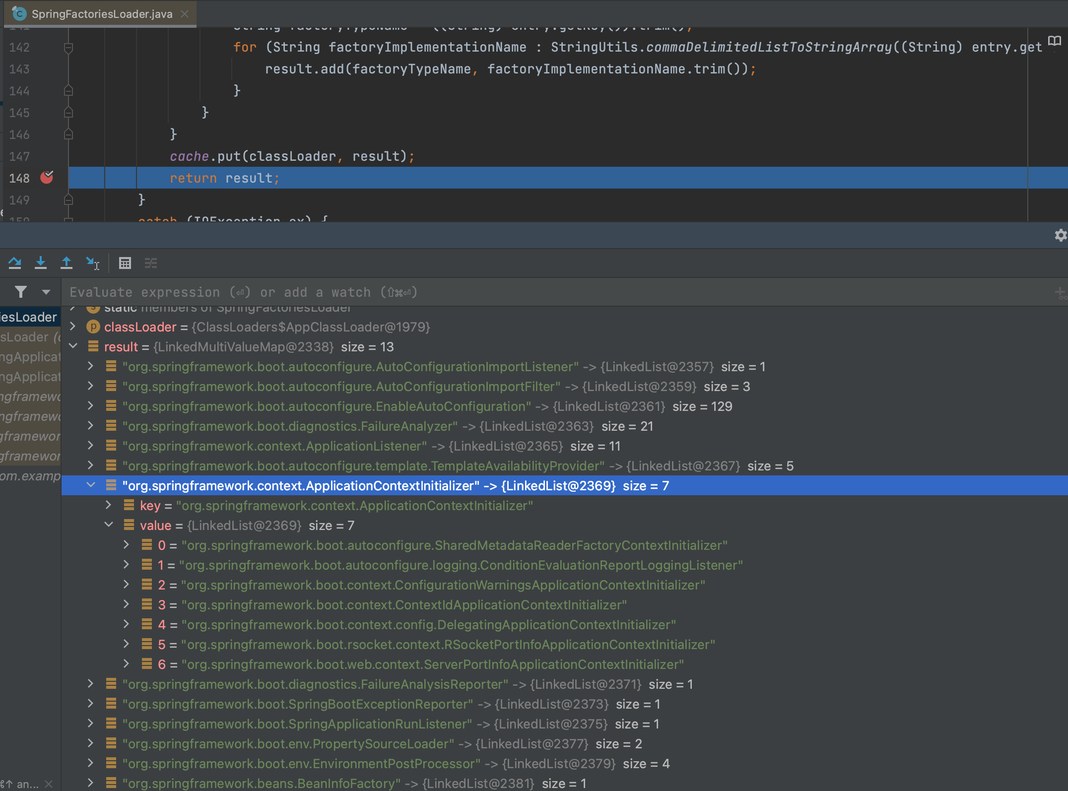 经过loadSpringFactories 处理 META-INF/spring.factories文件所有的配置信息均已经存储在cache中。