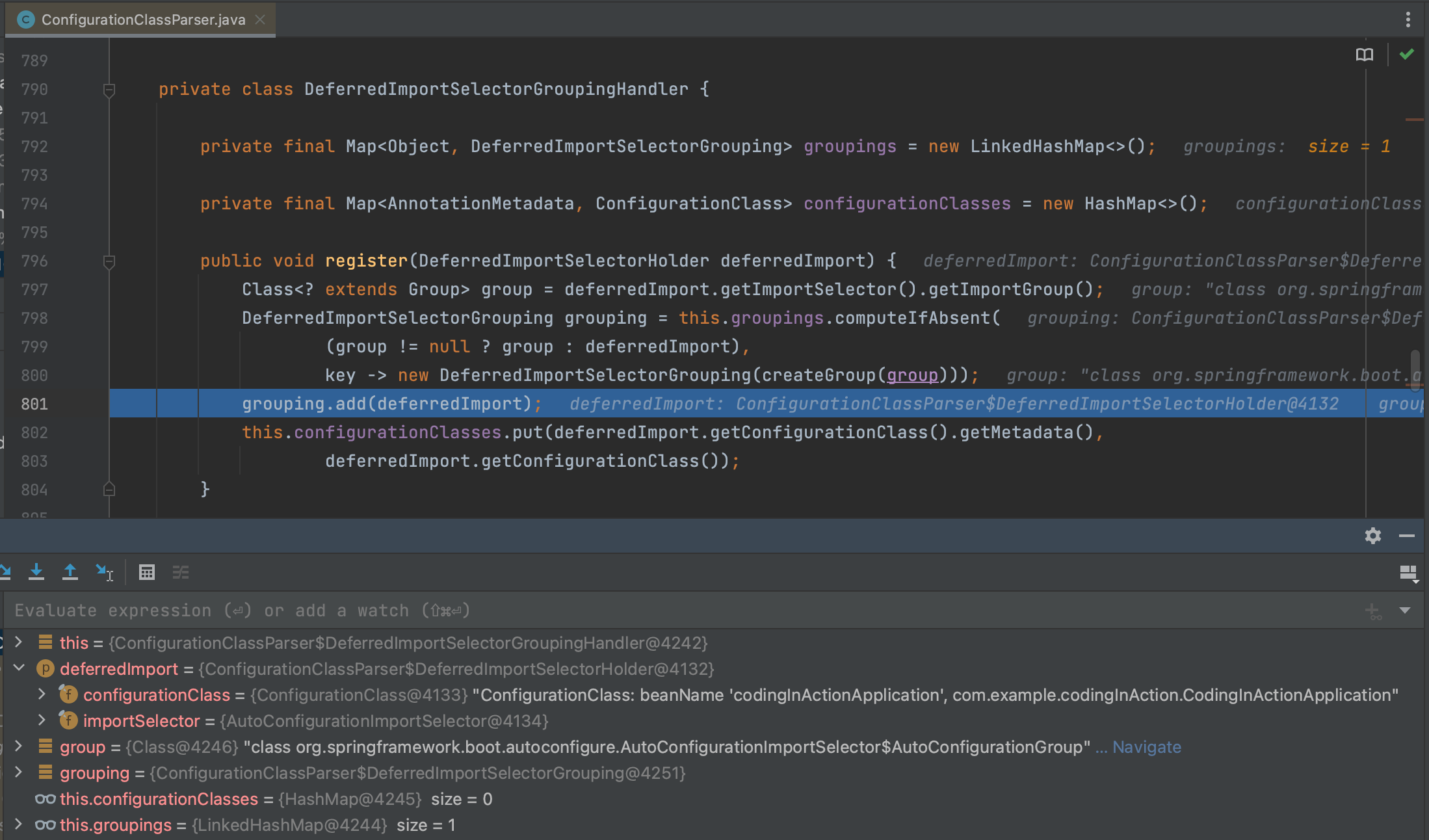 先进入register, 将AutoConfigurationImportSelector这个DeferredImportSelector 添加到configurationClasses这个map h中,前面经过parse 阶段解析出业务bean 信息都在map 中