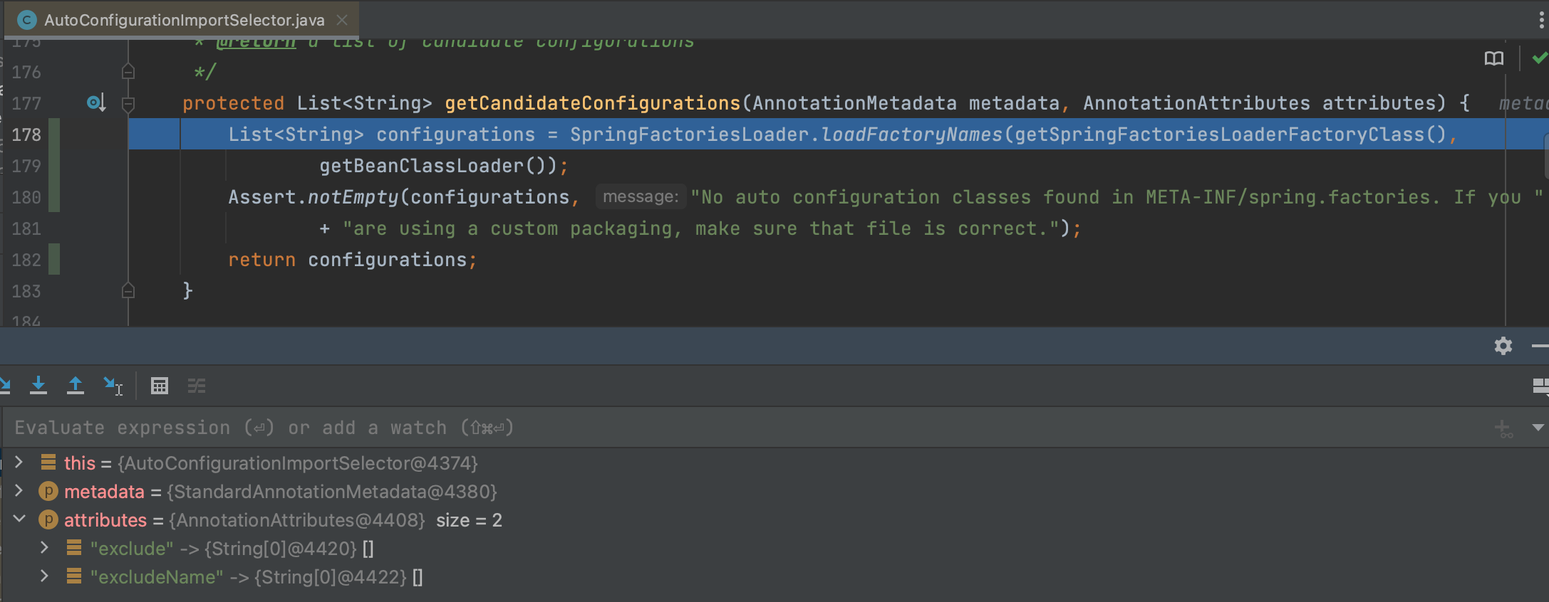 在这里能够看到getImports,最终调用的的是SpringFactoriesLoader.loadFactoryNames, 这个方法SpringApplication初始化时已经执行读取过所有的META-INF/spring.factories文件,所以这里会直接使用cache 里面的数据,不会重复读取META-INF/spring.factories文件了。