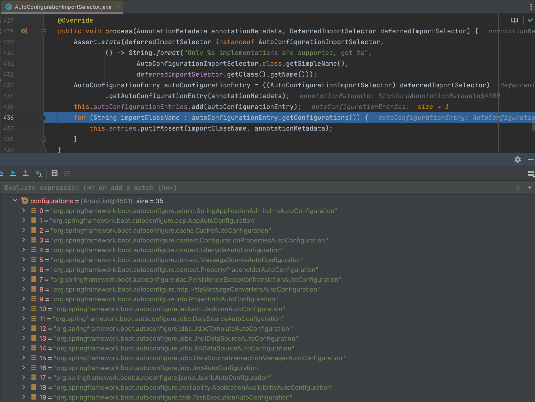 ConfigurationClassParser通过对@Import注解的处理,解析出AutoConfigurationImportSelector。AutoConfigurationImportSelector才是最终负责自动配置类解析的工具, 因为它是DeferredImportSelector,所以AutoConfigurationImportSelector会先通过反射实例化然后记录下来,- 等其他bean parse 工作完成后,再把