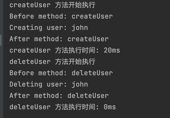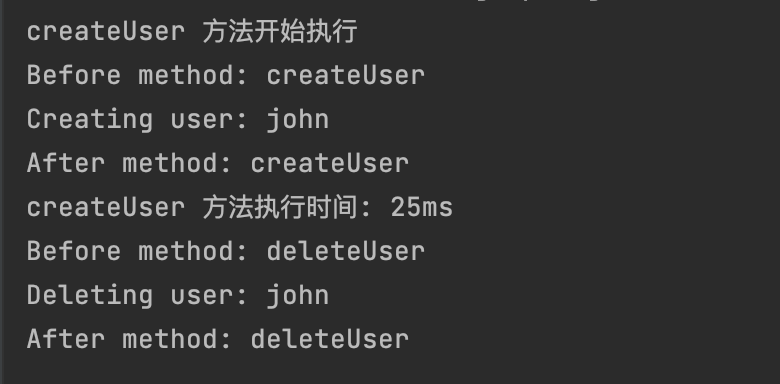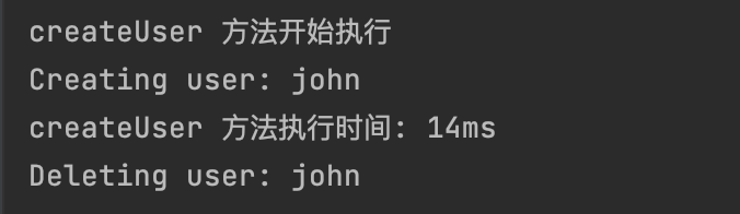 @Around("execution(* com.example.codingInAction.service.UserService.createUser(..))") public Object logAround(ProceedingJoinPoint joinPoint) throws Throwable { long startTime = System.currentTimeMillis(); System.out.println(joinPoint.getSignature().getName() + " 方法开始执行");