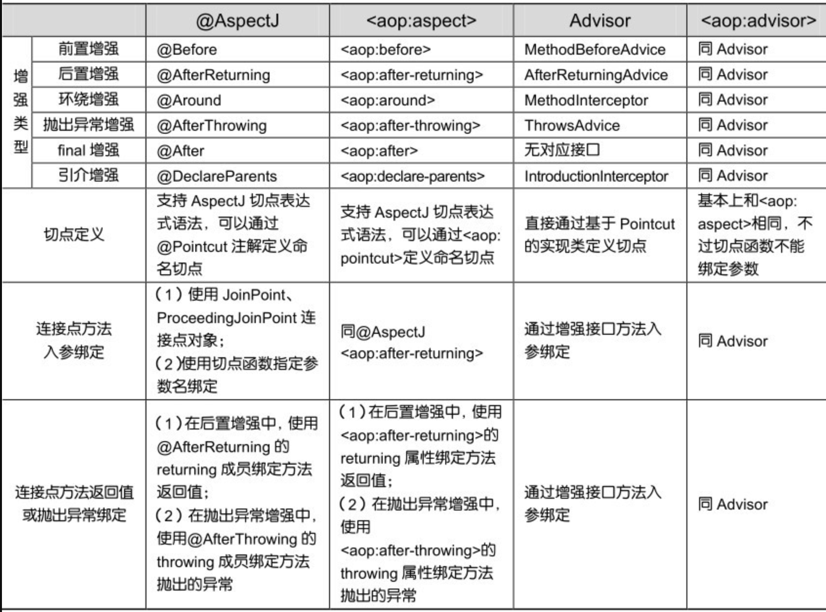 以上提到的所有AOP 配置方式中,不论是使用手动配置的ProxyFactoryBean,还是自动代理的BeanNameAutoProxyCreator、DefaultAdvisorAutoProxyCreator,都需要实现Pointcut和Advice接口描述切点和增强,并用Advisor整合两者。