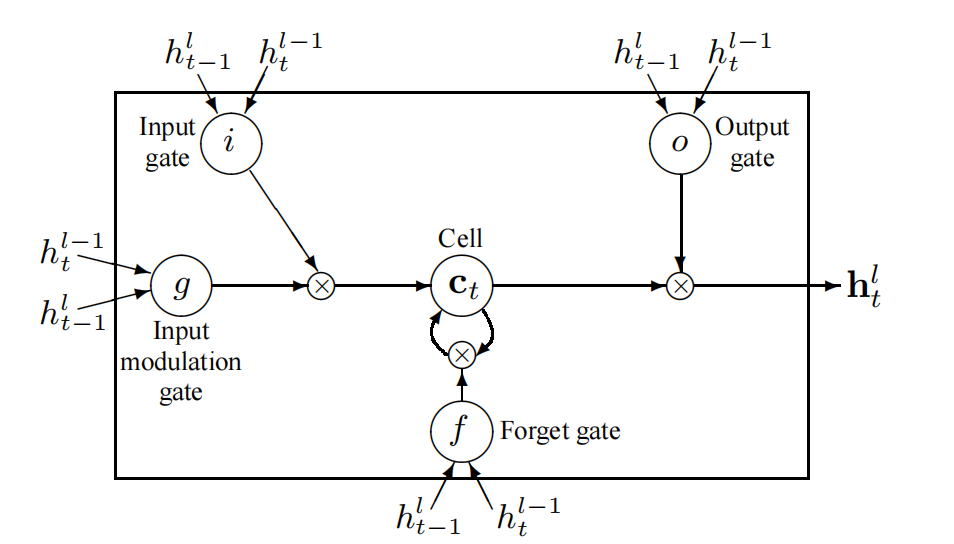 LSTM : $h_t^{l-1}$, $h_{t-1}^l$, $c_{t-1}^l \rightarrow h_t^l$, $c_t^l$