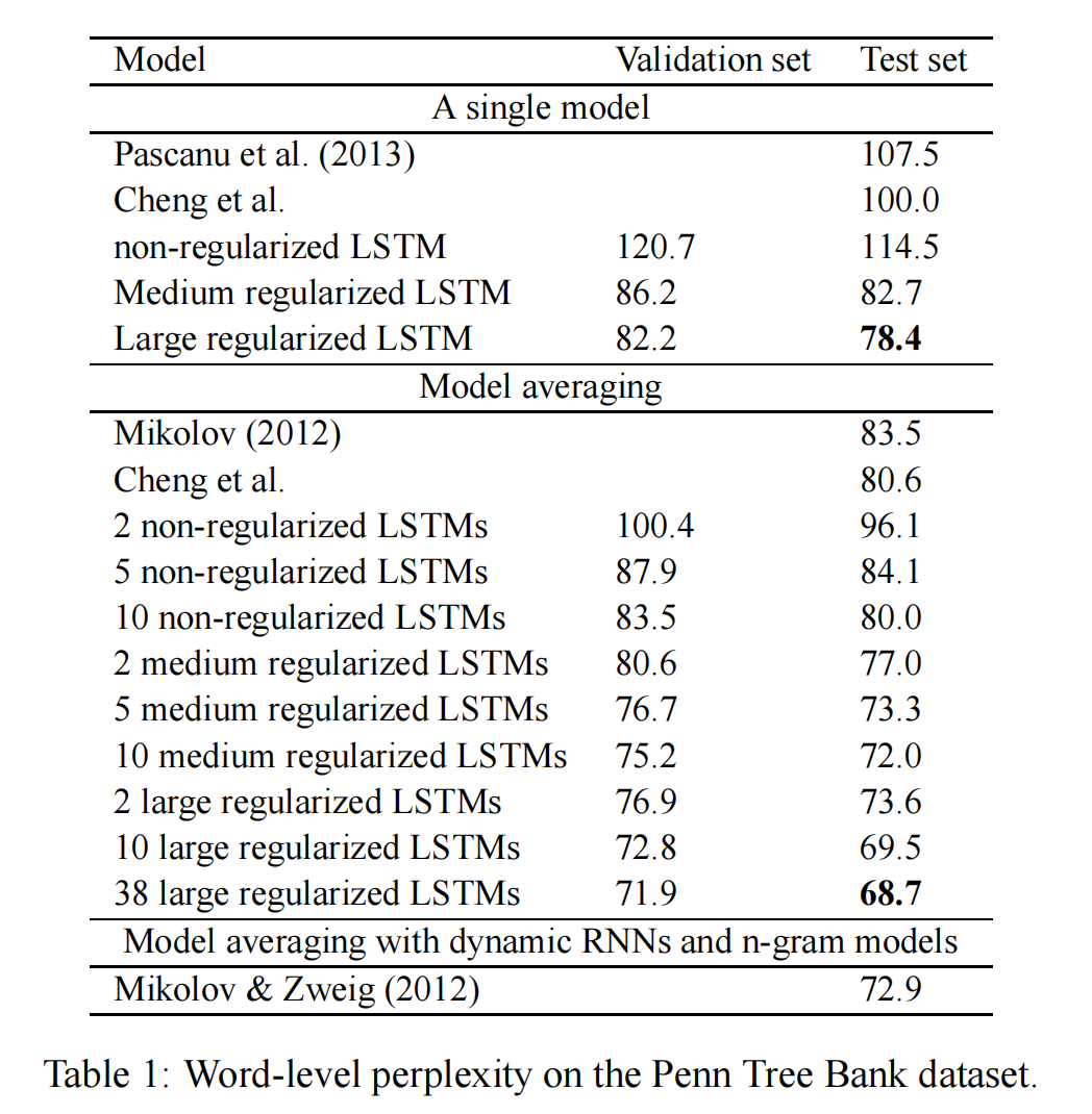 表1比较了以前的结果和我们的LSTM,图4显示了从单个大型正则化LSTM中抽取的样本。