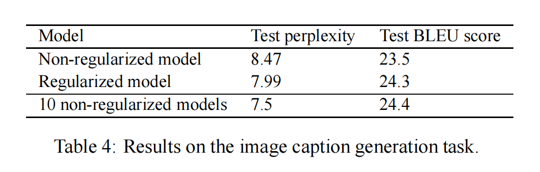 We applied the dropout variant to the image caption generation model of Vinyals et al. (2014). The image caption generation is similar to the sequence-to-sequence model of Sutskever et al. (2014), but where the input image is mapped onto a vector with a highly-accurate pre-trained convolutional neural network (Szegedy et al., 2014), which is converted into a caption with a single-layer LSTM (see Vinyals et al. (2014) for the details on the architecture). We test our dropout scheme on LSTM as the convolutional neural network is not trained on the image caption dataset because it is not large (MSCOCO (Lin et al., 2014)).