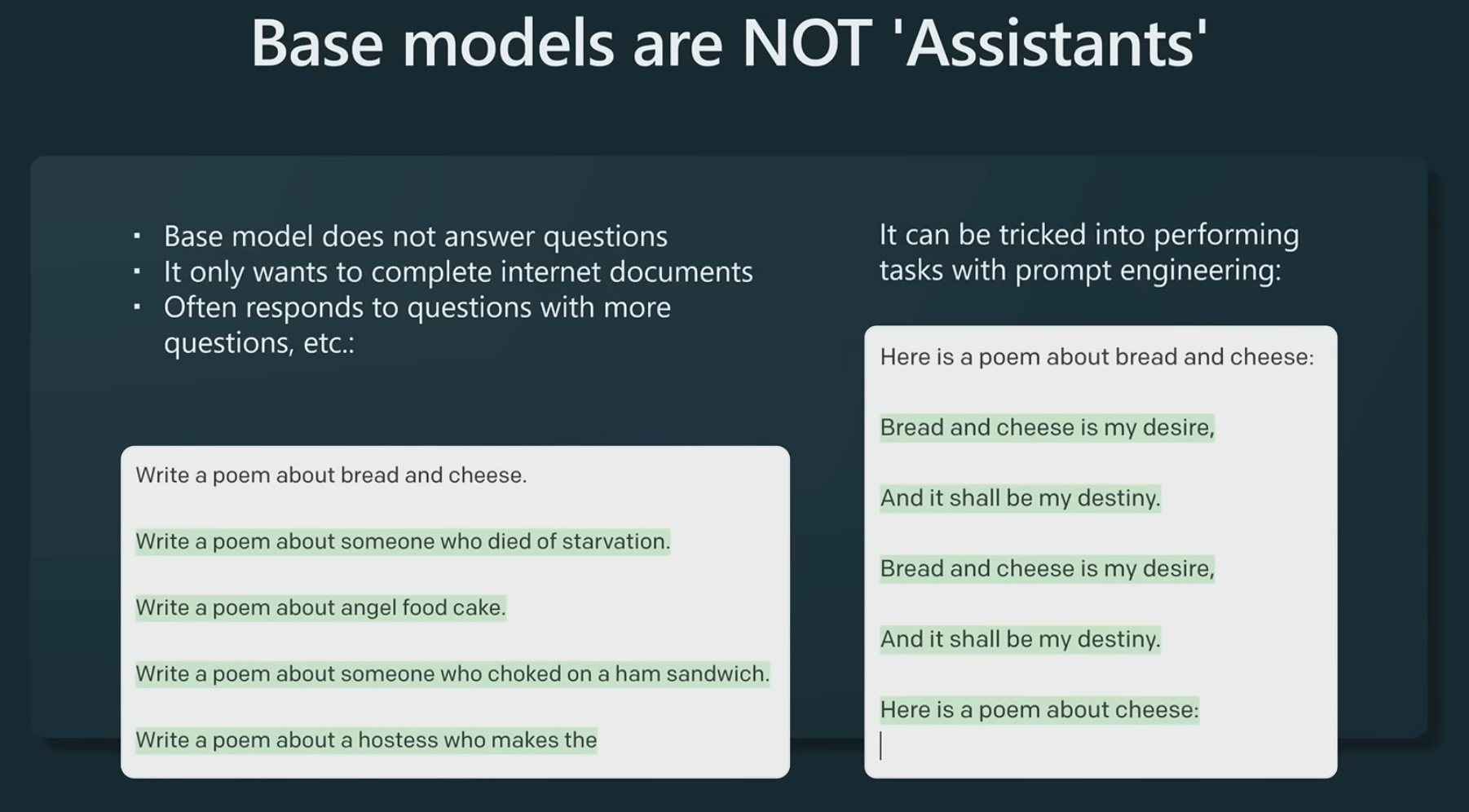 预训练阶段得到的base model 只是一个文档生成器, 只会根据你输入的内容去预测下一个单词,并不会回答你的问题,所以还起不到assistant 助手 的作用。 如图中,base model 并不会按照你的要求写诗,知识生成相似的内容。