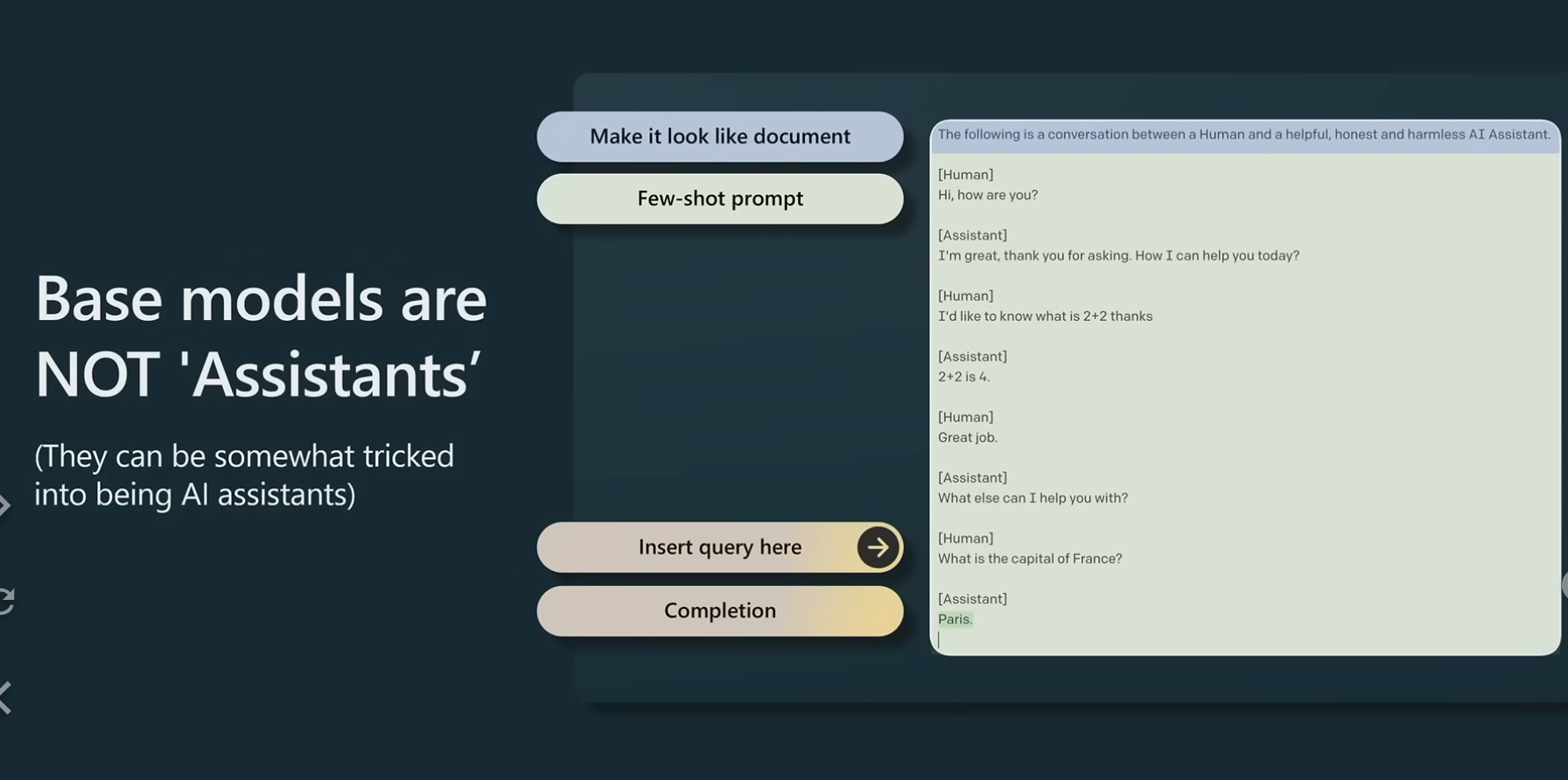 再例如针对以上问题,base model 并不会回答问题,给出“Paris”, 而是会续写内容, 给出以下可能的答案