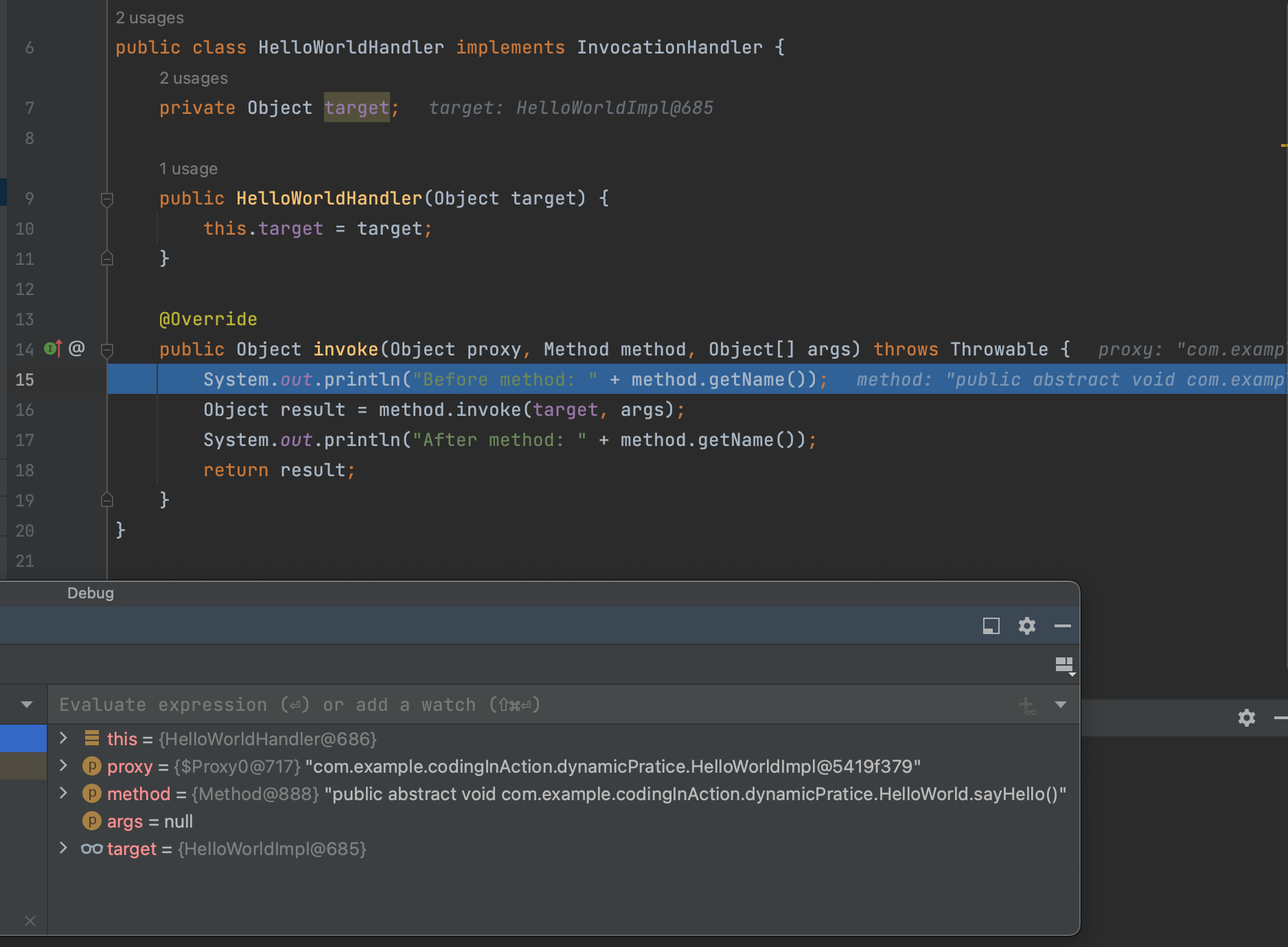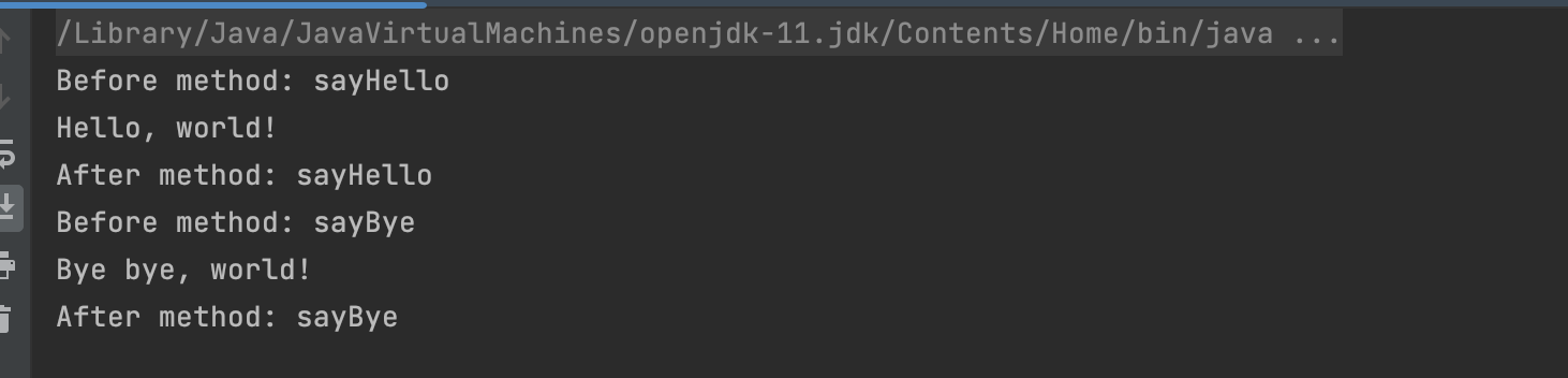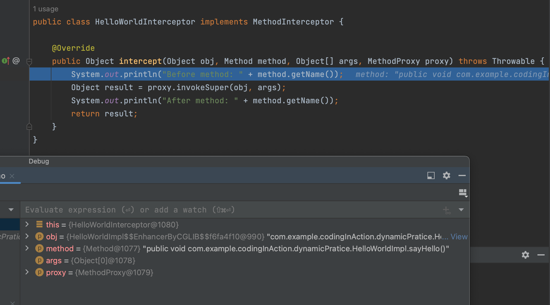 2.3 MethodInterceptor 1 2 3 4 5 6 7 8 9 10 11 enhancer.setCallback(new HelloWorldInterceptor ()); public class HelloWorldInterceptor implements MethodInterceptor { @Override public Object intercept (Object obj, Method method, Object[] args, MethodProxy proxy) throws Throwable { System.out.println("Before method: " + method.getName()); Object result = proxy.invokeSuper(obj, args); System.out.println("After method: " + method.getName()); return result; } }