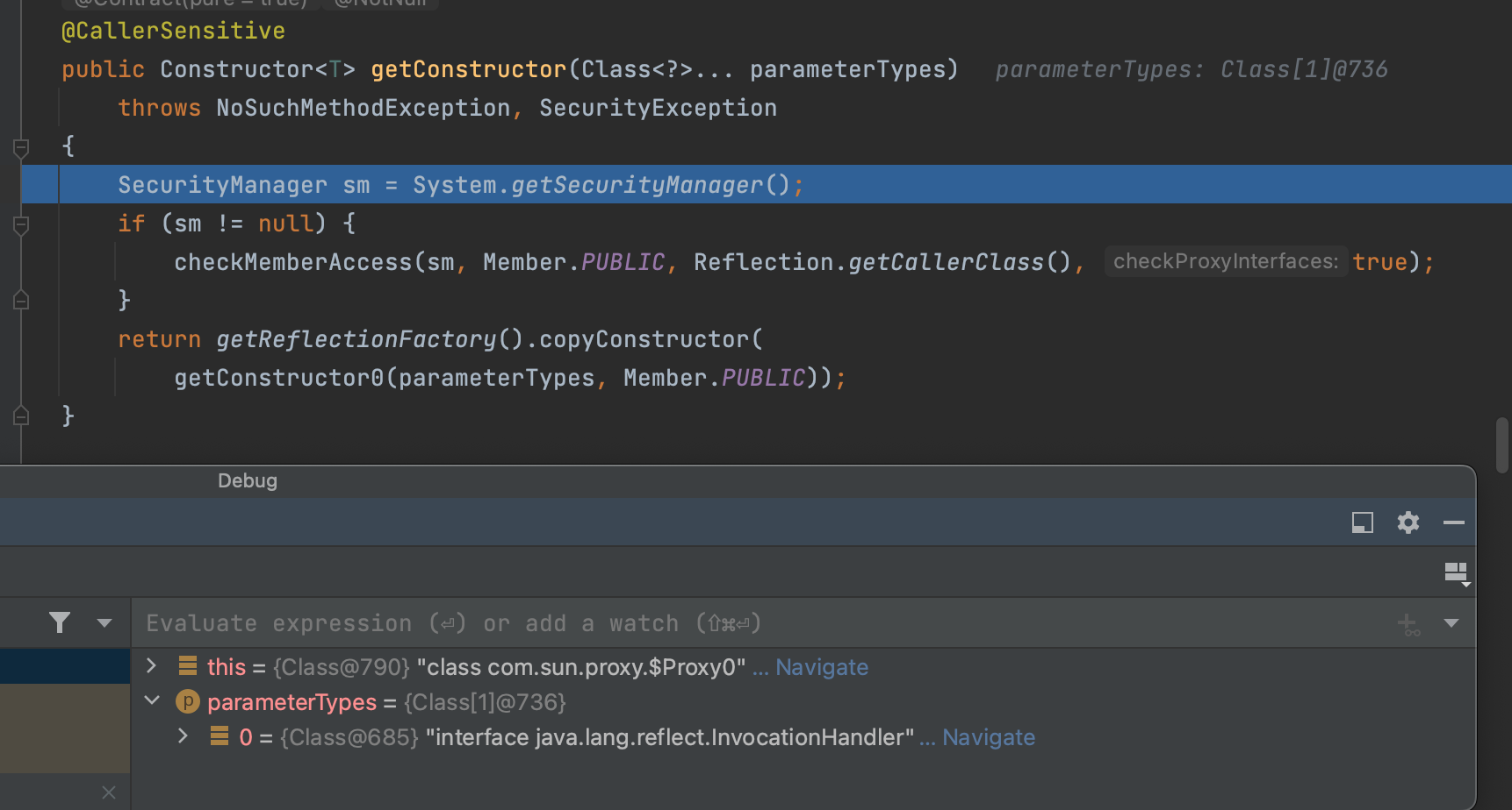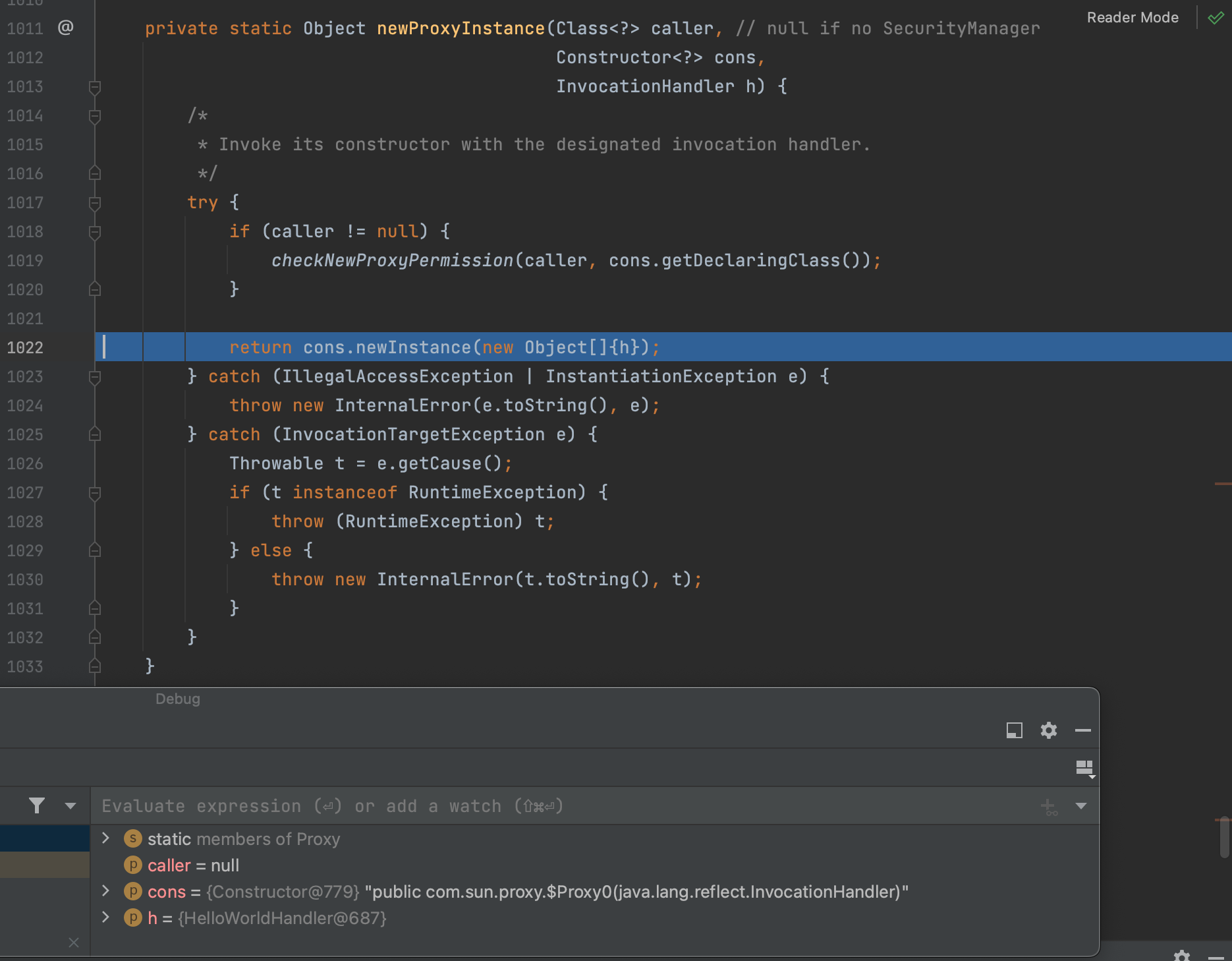 1 2 3 4 5 6 7 8 9 10 11 12 public class Proxy implements java .io.Serializable { @CallerSensitive public static Object newProxyInstance (ClassLoader loader, Class<?>[] interfaces, InvocationHandler h) { Constructor<?> cons = getProxyConstructor(caller, loader, interfaces); return newProxyInstance(caller, cons, h); } }