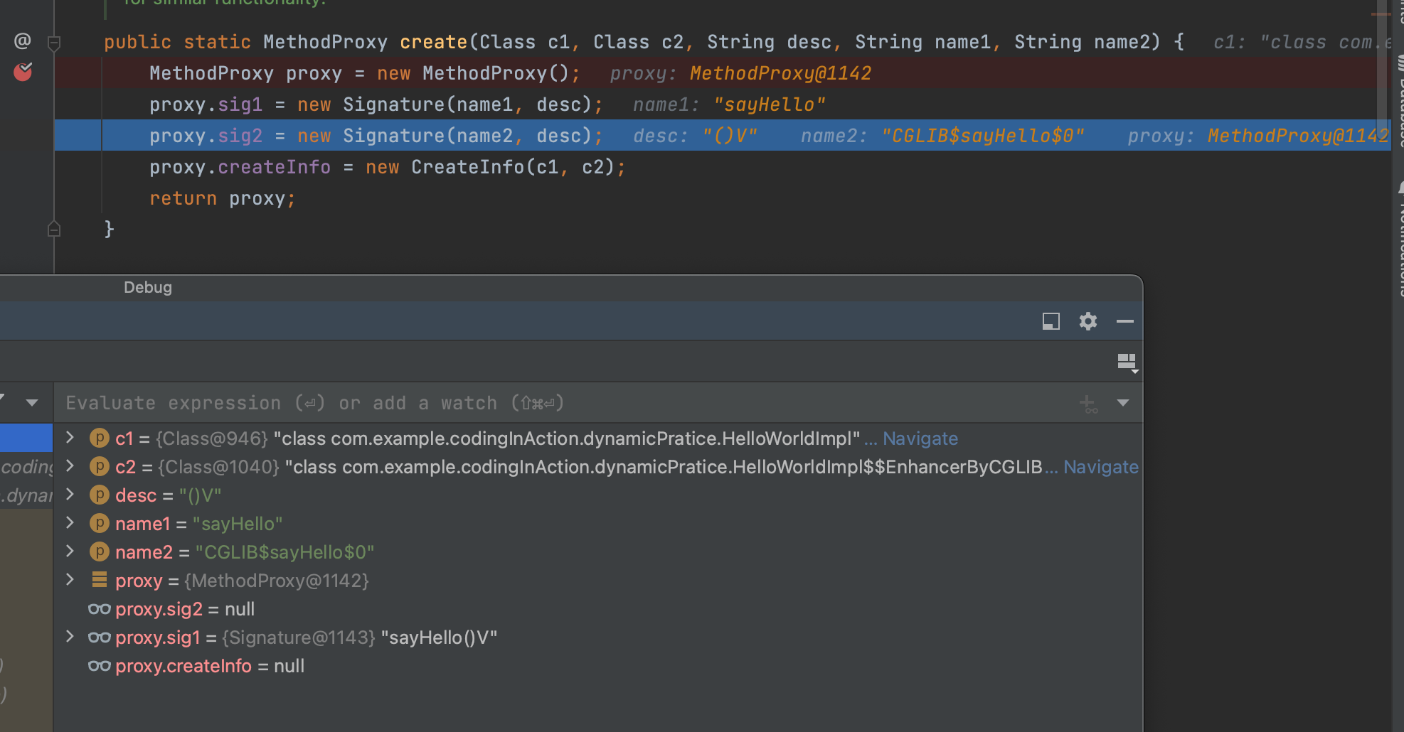 结合debug 信息, 解释MethodProxy.create 方法中,各个参数的含义