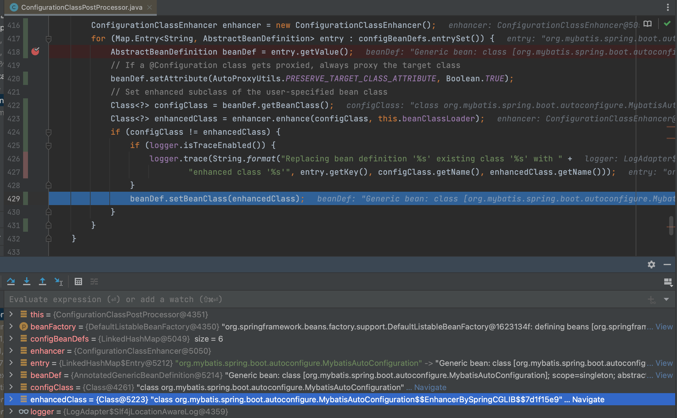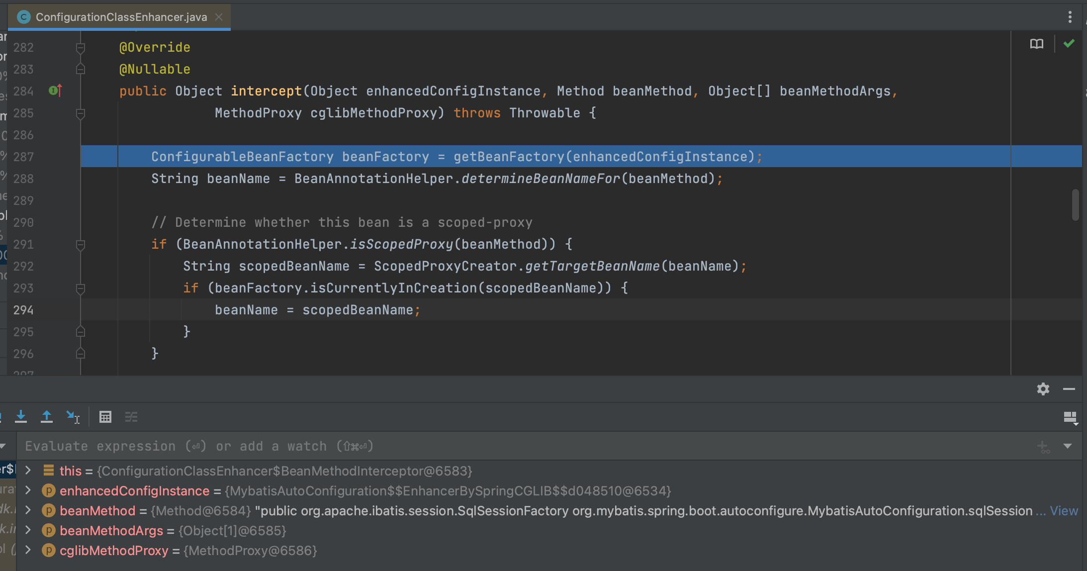 在Spring boot 自动配置实现原理一文中,已经详细介绍过自动配置类的加载与BeanDefinition 注册过程, 在其中9.5 小节中讲了在ConfigurationClassPostProcessor中重写的BeanFactoryPostProcessor.postProcessBeanFactory中,实现了对@Configuration 注解动态代理类的生成。 这里讲以MybatisAutoConfiguration 的实例化为例详细讲解这一过程
