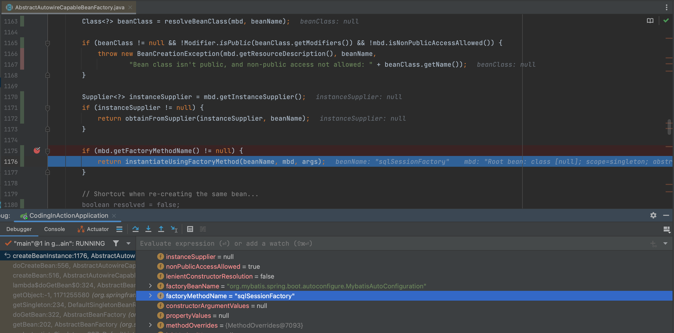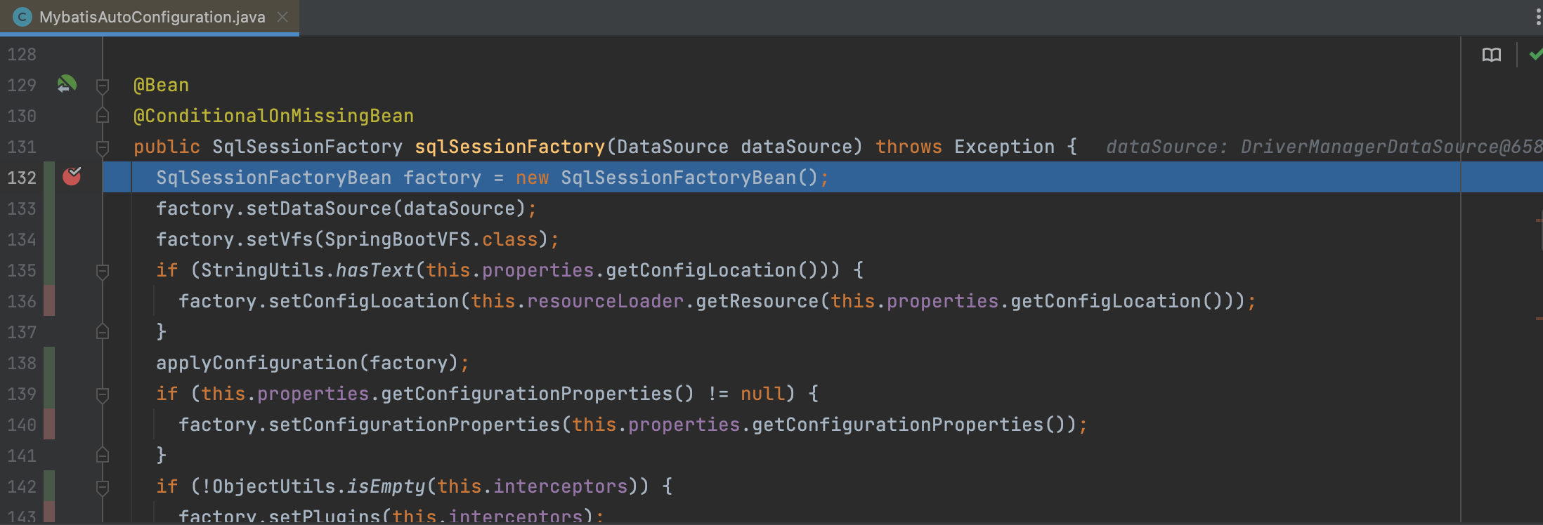 关于SpringBoot 自动配置机制的实现原理,可以点击Spring boot 自动配置实现原理阅读了解。 下面将忽略MybatisAutoConfiguration配置的加载和BeanDefinition 注册流程,直接进入实例化过程进行分析