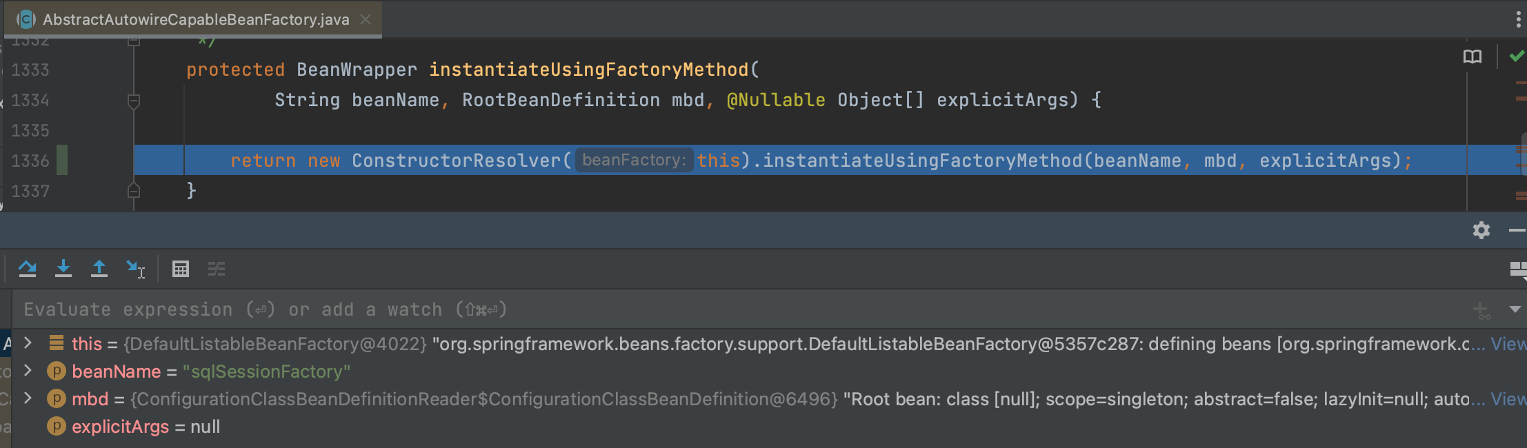 针对sqlSessionFactory ,其实例化过程使用的是 instantiateUsingFactoryMethod工厂方法实例化