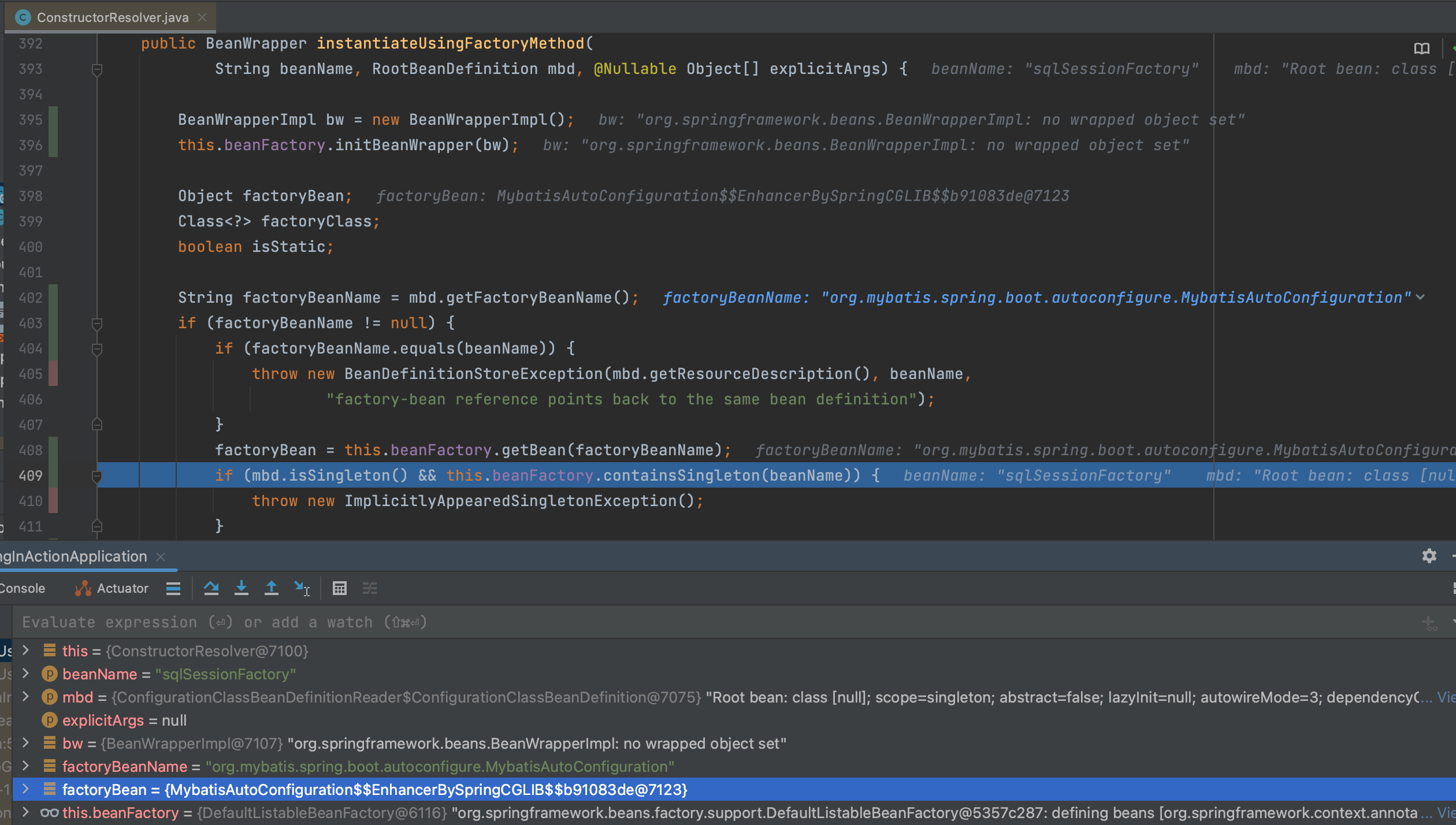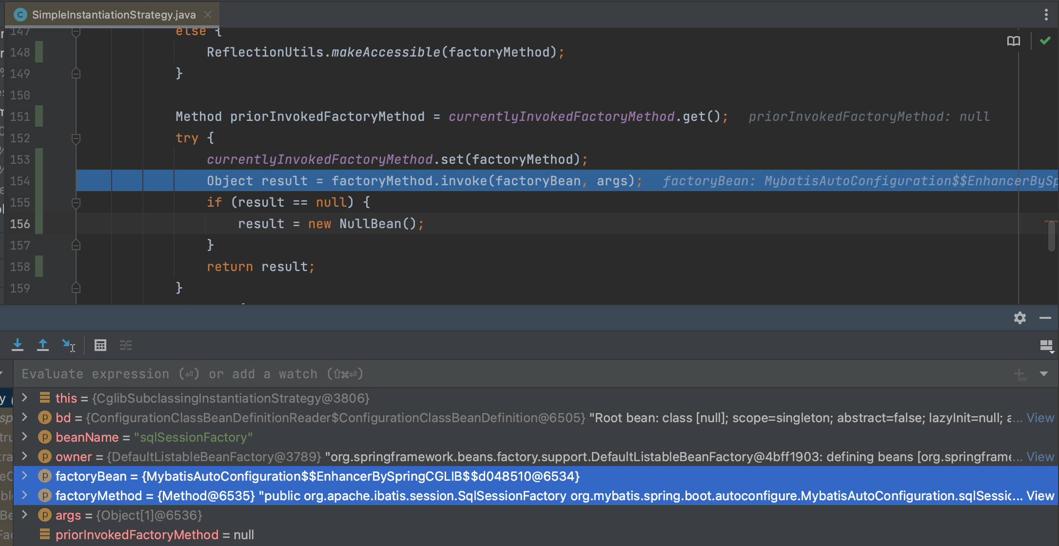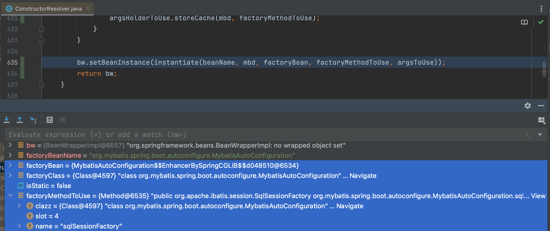 最后解析出, 使用instantiateUsingFactoryMethod实例化sqlSessionFactory 时, 用到的factoryBean 是 MybatisAutoConfiguration 的动态代理对象,用的方法是sqlSessionFactory