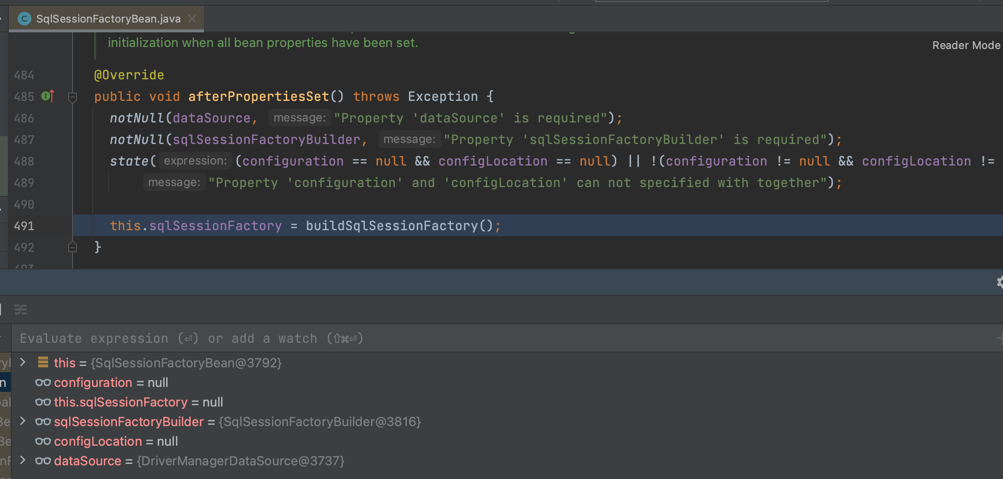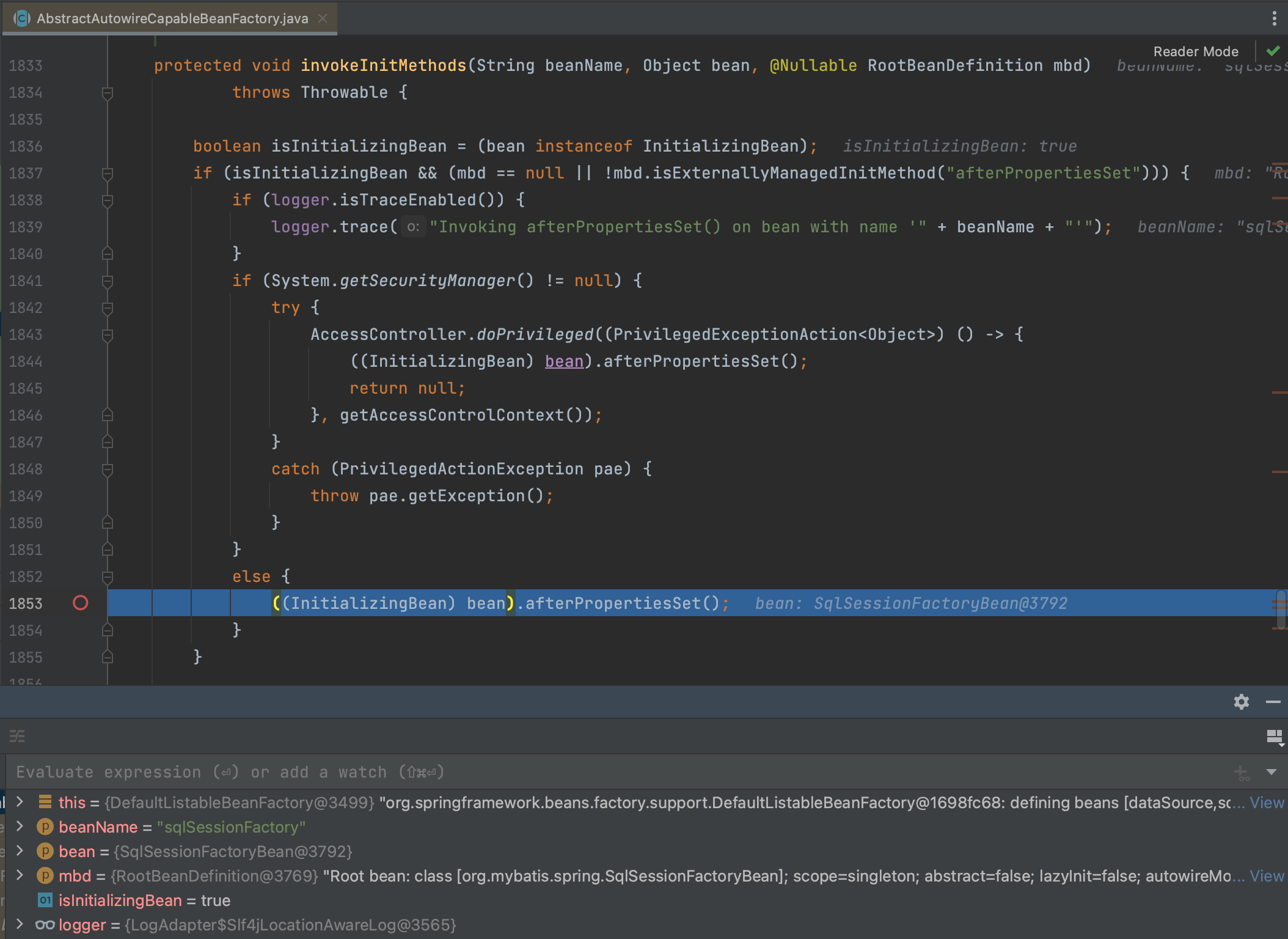获取SqlSessionFactoryBean实例,跳过getBean 的其他代码直接来到init 阶段, InitionlizingBean 相关的逻辑