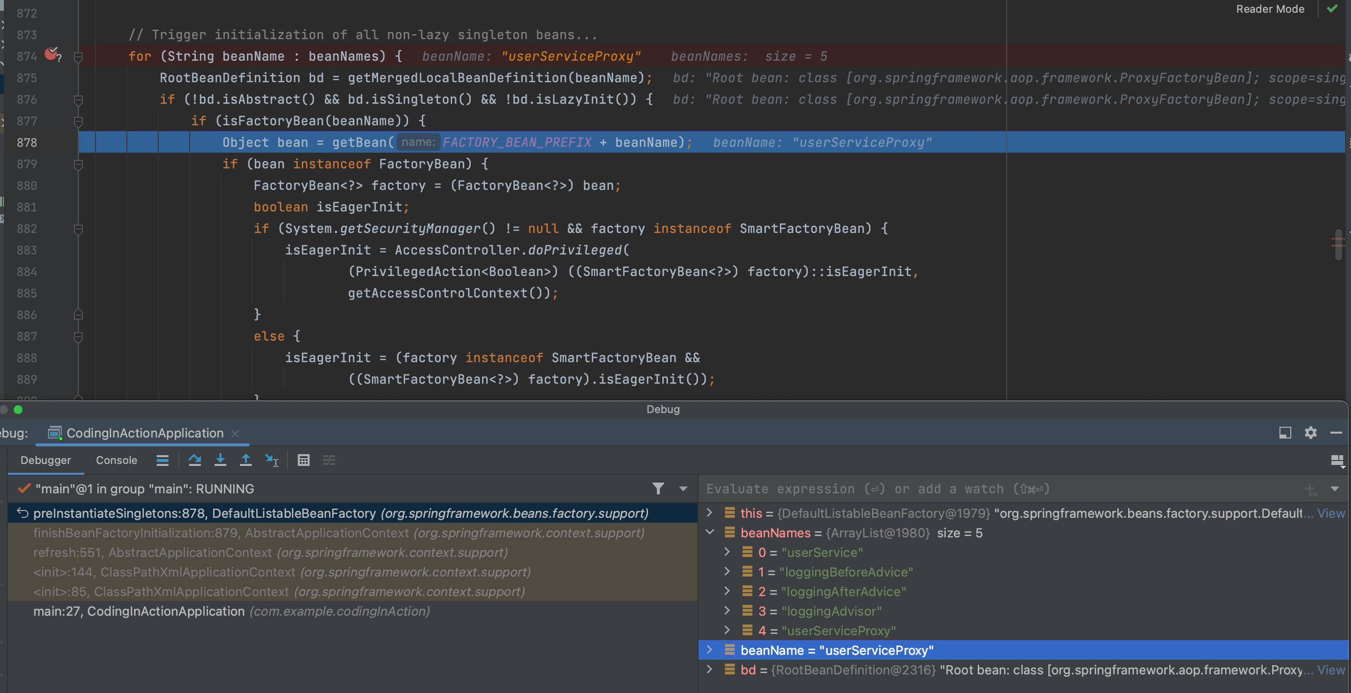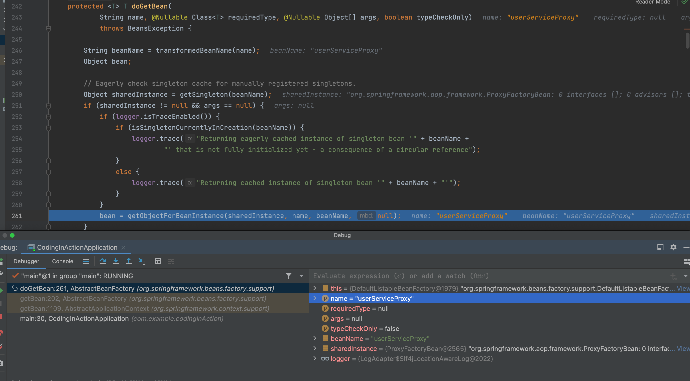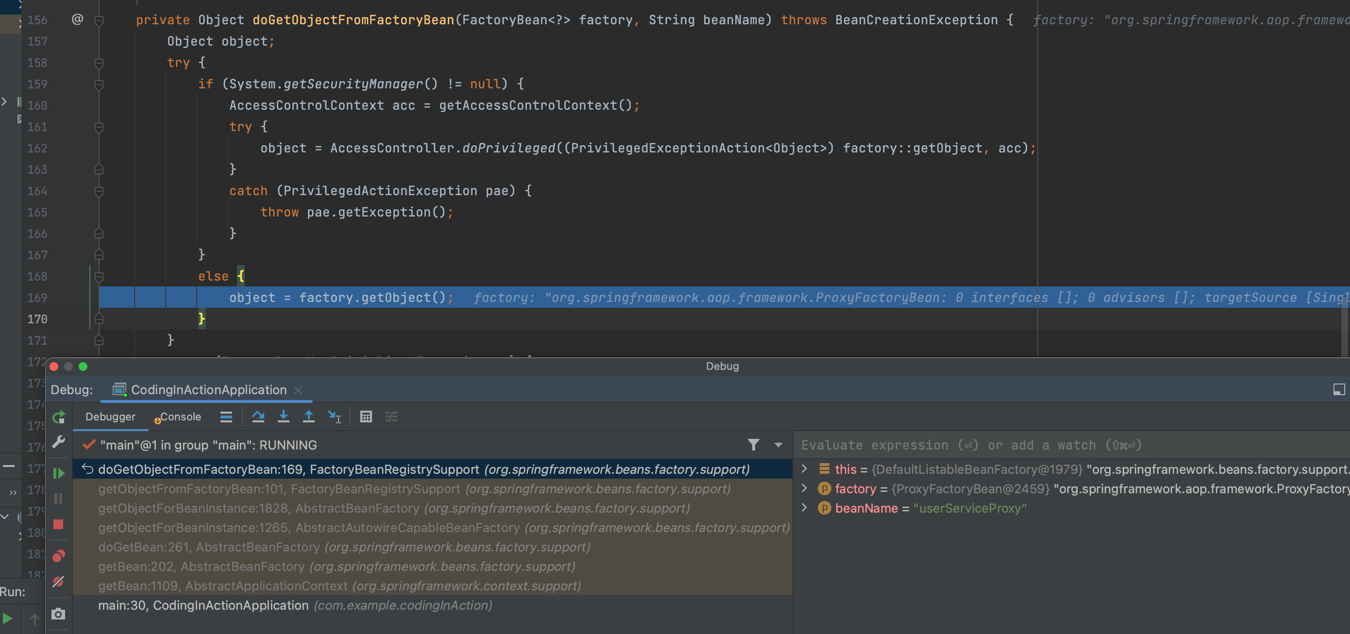 可以看到getBean传参的时候,beanName 前增加了 & 标识,说明这个getBean 流程需要获取的是userServiceProxy这个个FactoryBean ,而不是由它创建的对象
