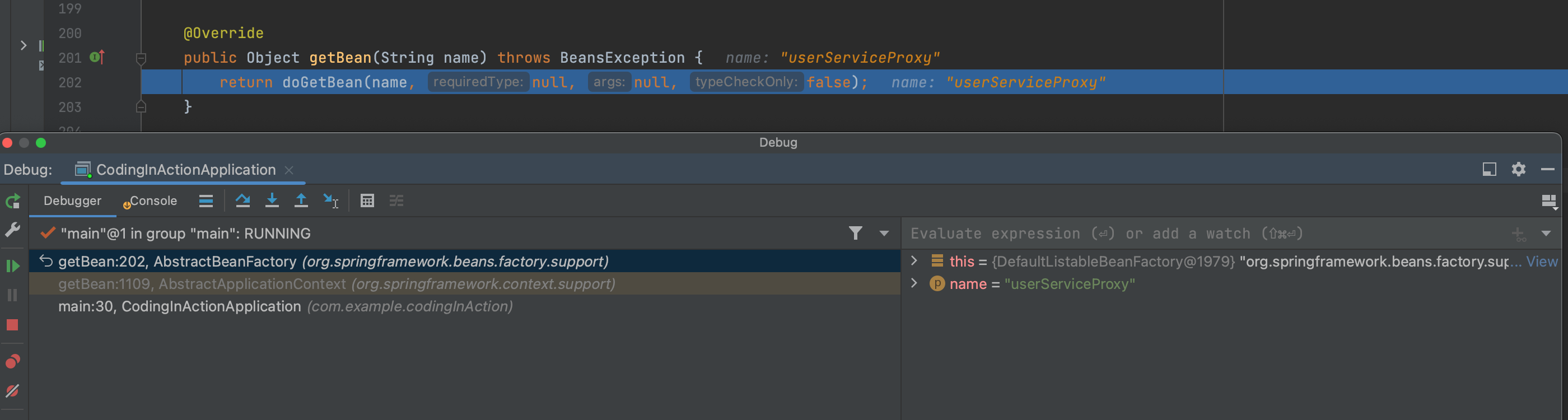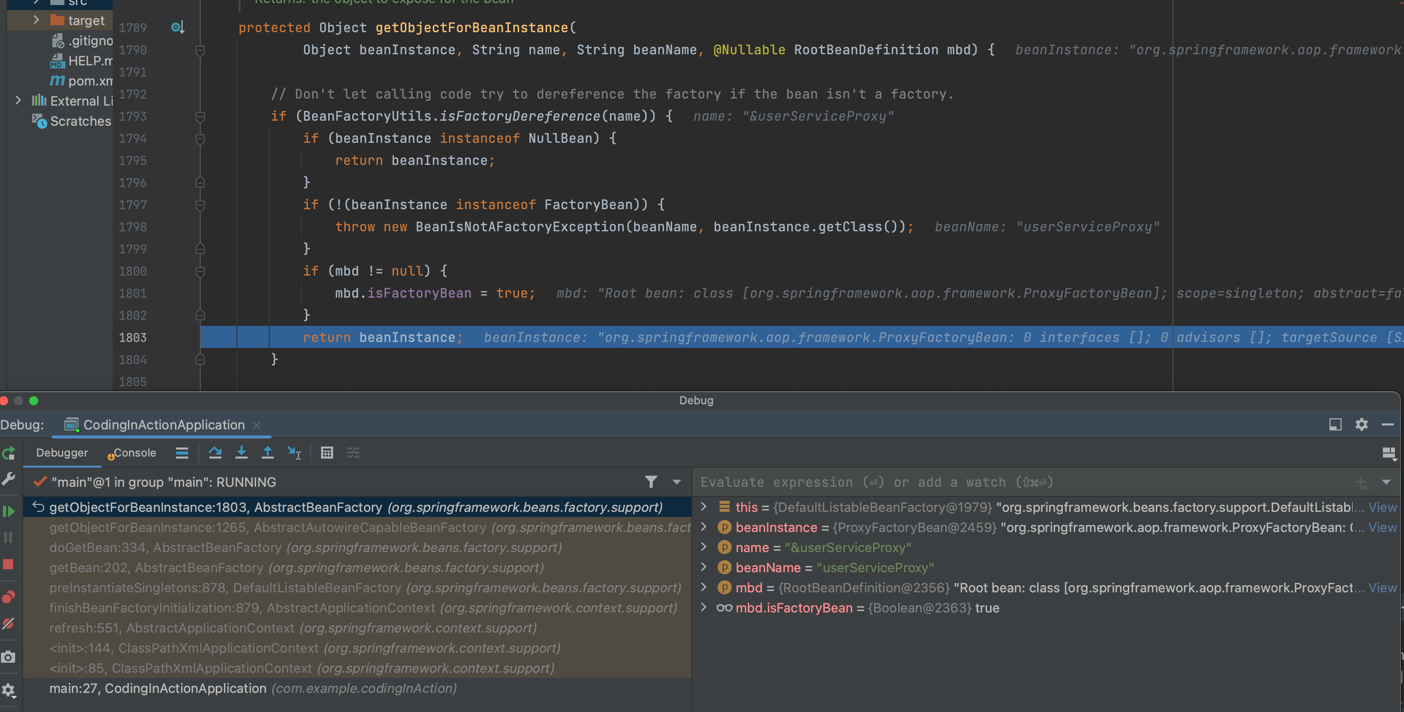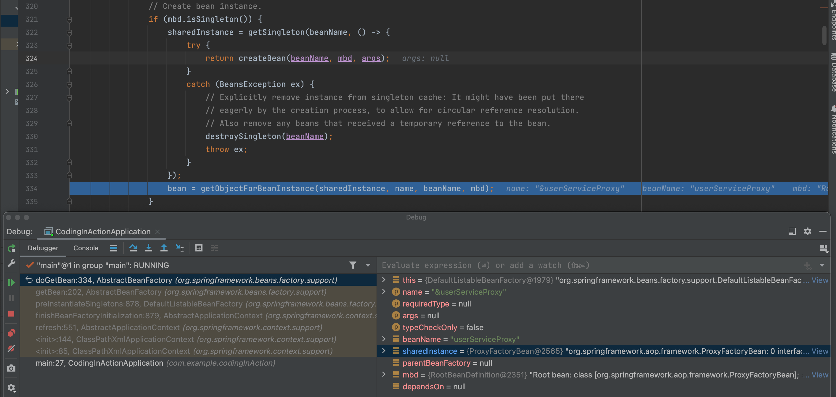 由于userServiceProxy 是FactoryBean, 现在执行getBean("beanName") 说明我们要获取由它创建的对象了。下面跟着代码进行简单分析。