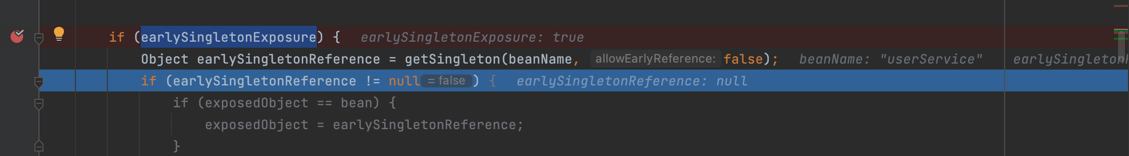 此时bean 与 exposedObject相等,说明在init阶段没有执行代理逻辑,doCreateBean 最终会返回提前暴露的引用earlySingletonReference