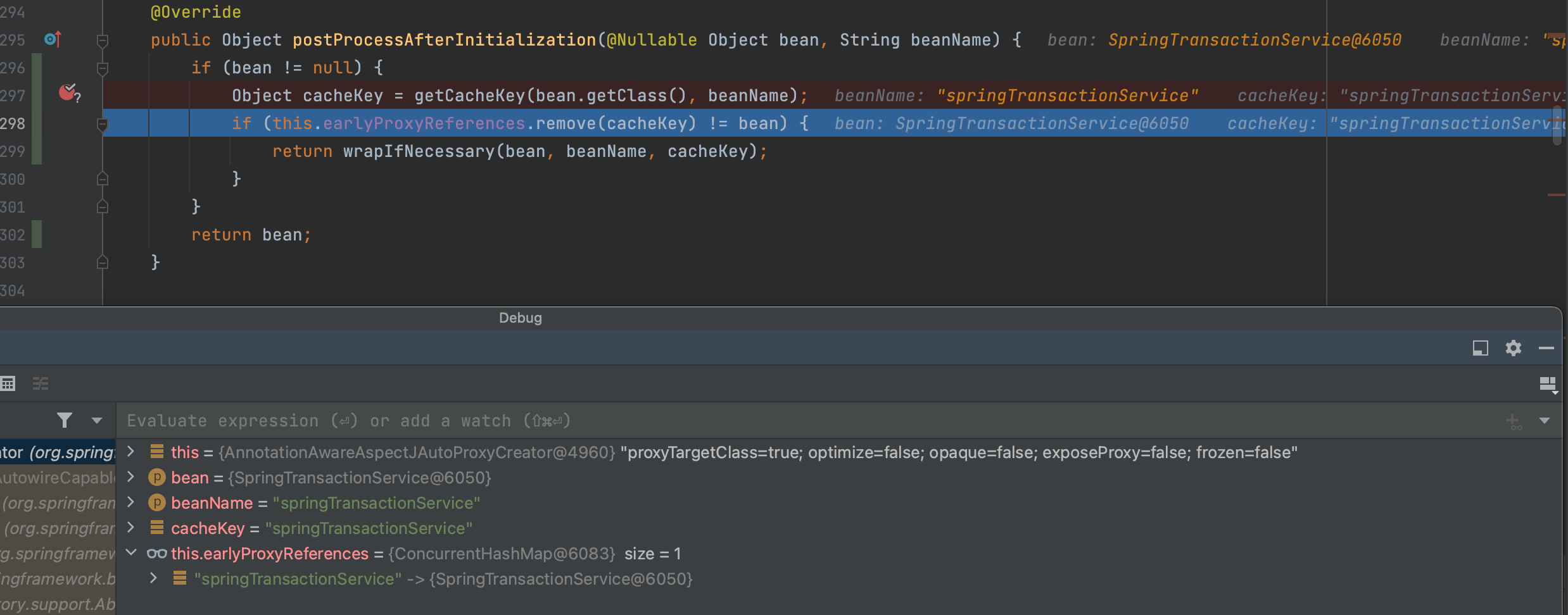 所以earlyProxyReferences中已经记录了springTransactionService相关数据,且和传进来bean数据一致,所以这里的逻辑会直接返回,而不是再走一遍wrapIfNecessary逻辑。