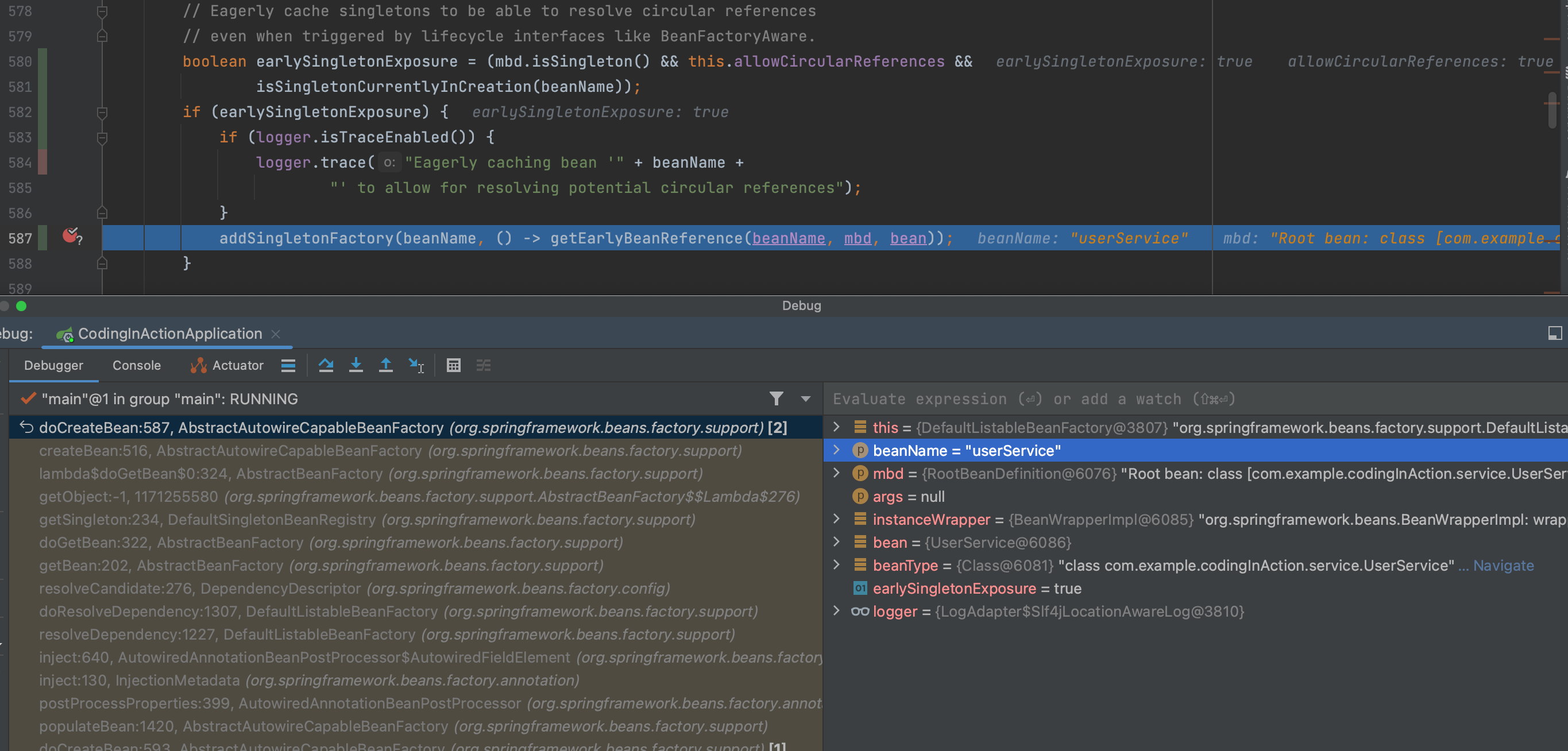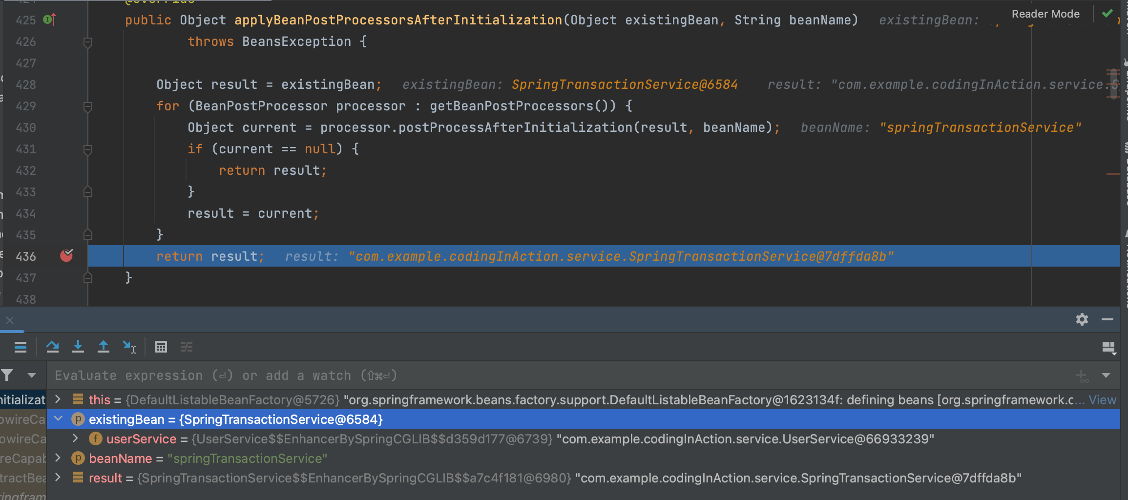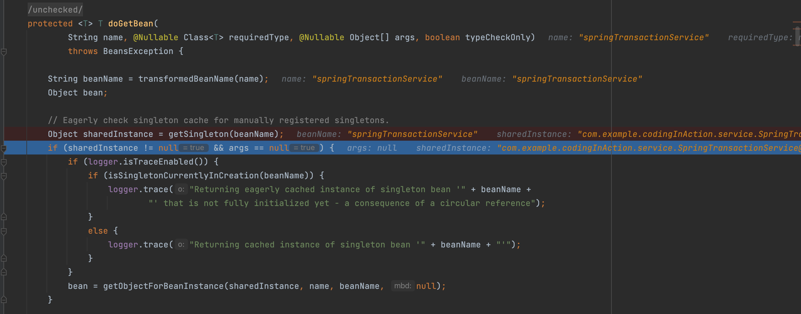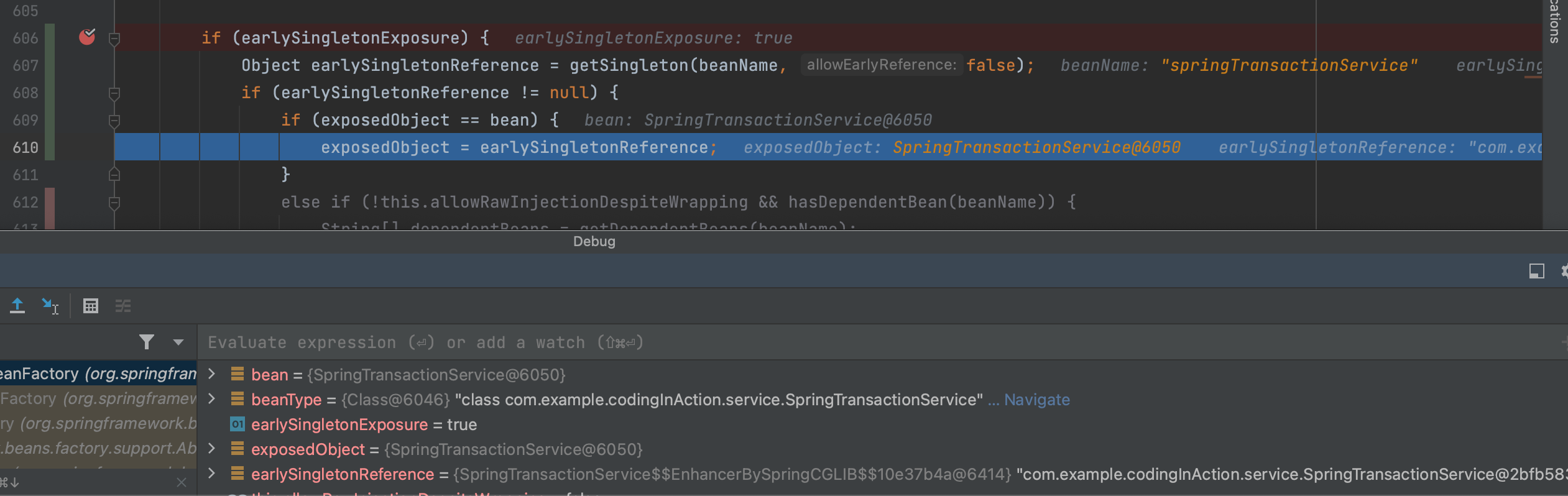 现在springTransactionService 已经完成了实例化的3个阶段,逻辑来到doCreateBean中最后关于循环依赖和早期引用的处理逻辑