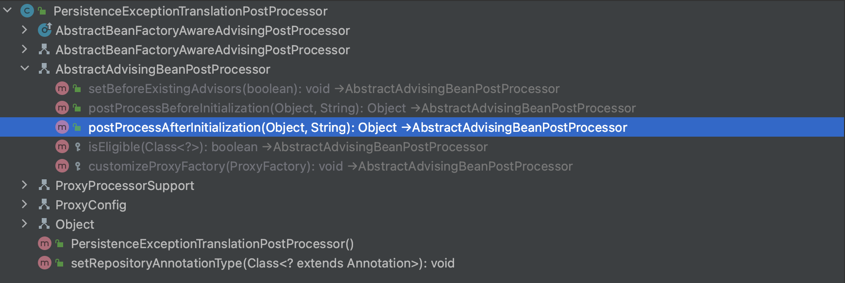 PersistenceExceptionTranslationPostProcessor 继承了AbstractAdvisingBeanPostProcessor , 因此使用了@Repository注解的bean 在实例化完成后,最终生成的是其代理对象。
